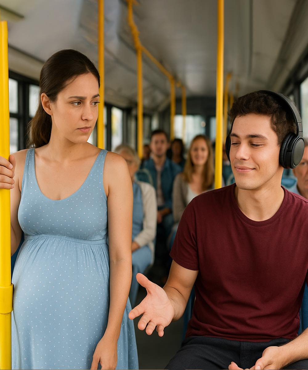 De stadsbus rammelde door een smalle straat, elke zitplaats bezet, elk stuur stevig vastgeklemd. De lucht binnenin was zwaar – dik van de hitte, het gekletter en het vage gepiep van oude remmen. Bij de volgende halte stapte een jonge vrouw aan boord. Ze droeg een eenvoudige zomerjurk, haar stappen voorzichtig, haar handen zachtjes rustend op haar ronde buik. Zeven maanden zwanger, bewoog ze zich met stille waardigheid, maar de spanning op haar gezicht maakte duidelijk: staan zou niet makkelijk worden.