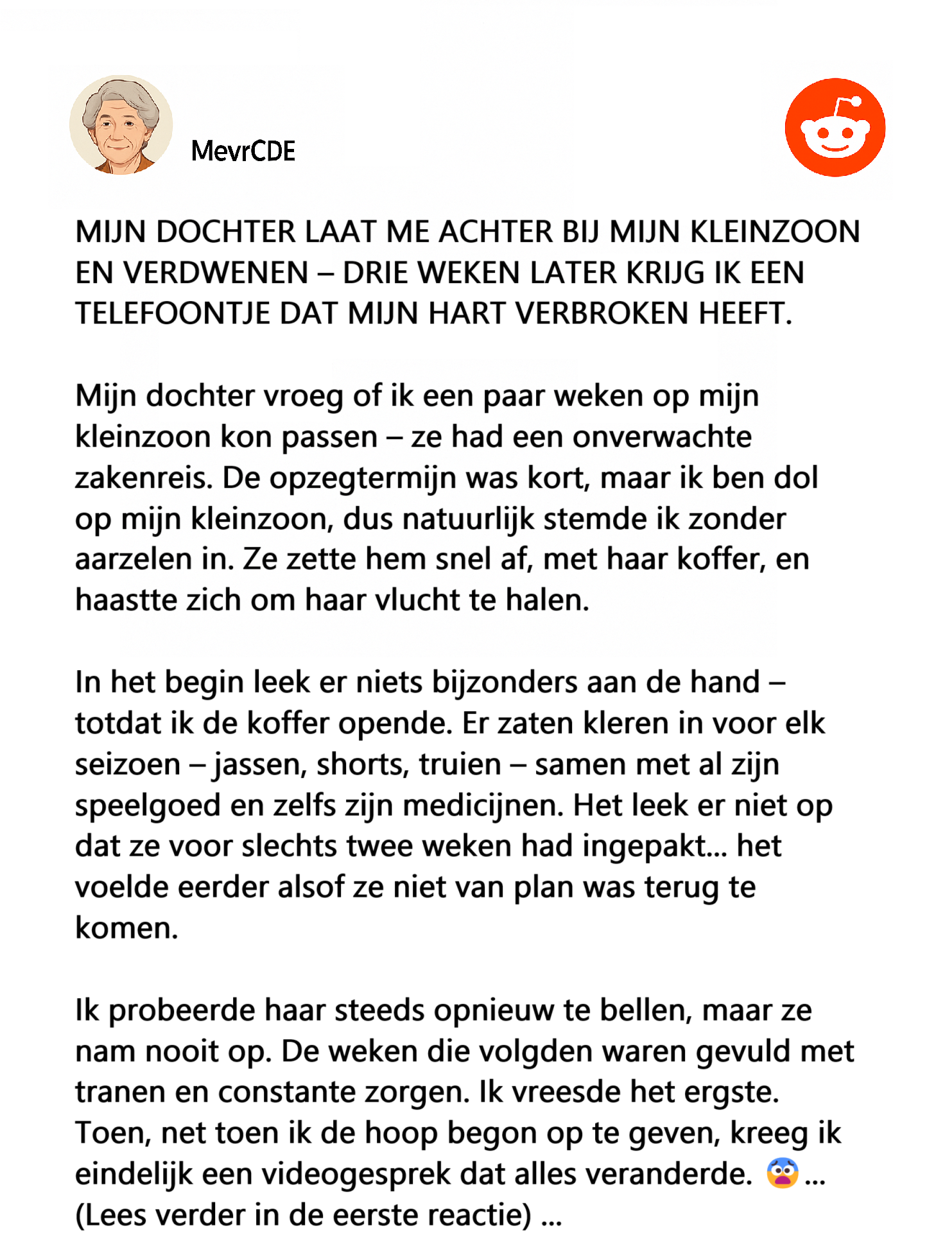 Ik had die dag geen bezoek verwacht, dus toen ik de deurbel hoorde, vroeg ik me af wie het zou zijn. Tot mijn verbazing zag ik mijn dochter Jane en mijn kleinzoon Tommy. « Mam, ik heb een gunst nodig, » zei ze. « Ik wil dat je een paar weken op Tommy past. Misschien iets langer dan … Lire plus