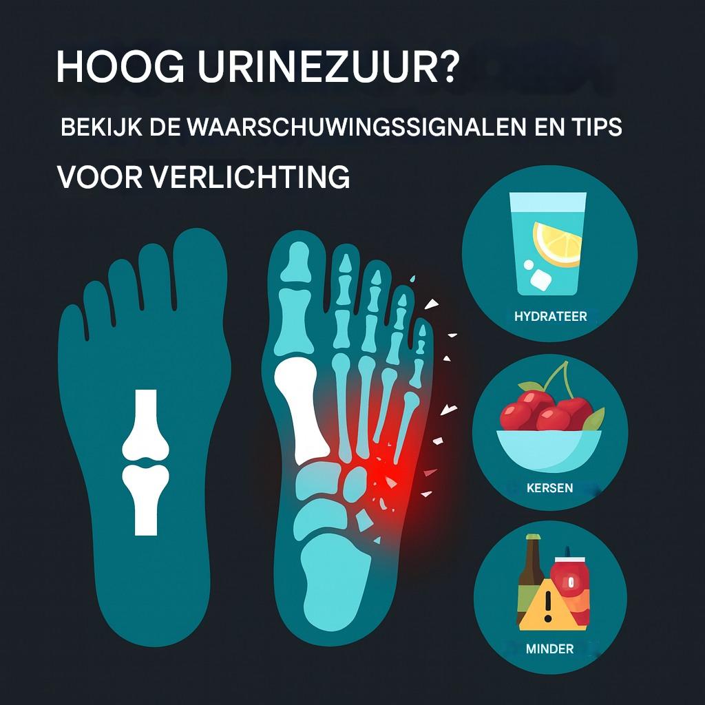 Meer water drinken helpt om urinezuur uit het lichaam te spoelen en voorkomt de vorming van urinezuurkristallen rond de gewrichten. Drink dus voldoende water, ongeveer 8 glazen per dag, en zorg dat je gehydrateerd blijft.