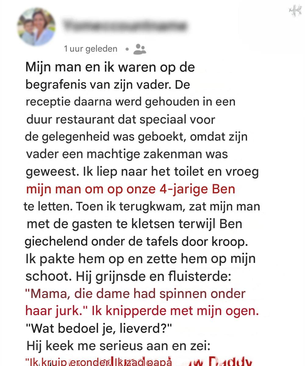 Toen ik hem vond, vertelde hij me zachtjes dat hij zijn vader het been van een andere vrouw had zien aanraken – een vrouw die ik altijd had vertrouwd.