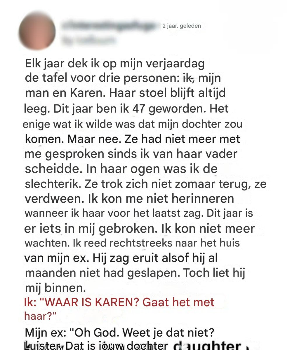 Mijn 47e verjaardag verliep in stilte, met slechts drie borden op tafel, één stoel onaangeroerd, een stille echo van de dochter met wie ik al twee jaar niet had gesproken.
