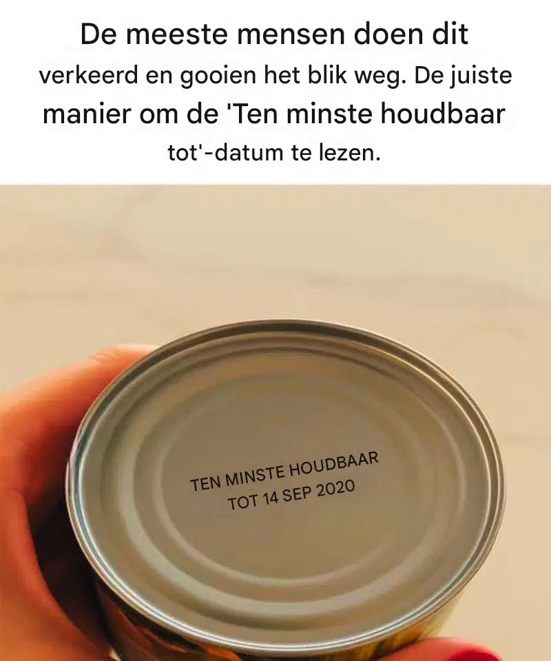 De enige datum die direct verband houdt met voedselveiligheid is de houdbaarheidsdatum. Deze datum wordt echter vaker gebruikt voor gevoelige producten zoals zuivel of vlees, en niet voor ingeblikt voedsel.