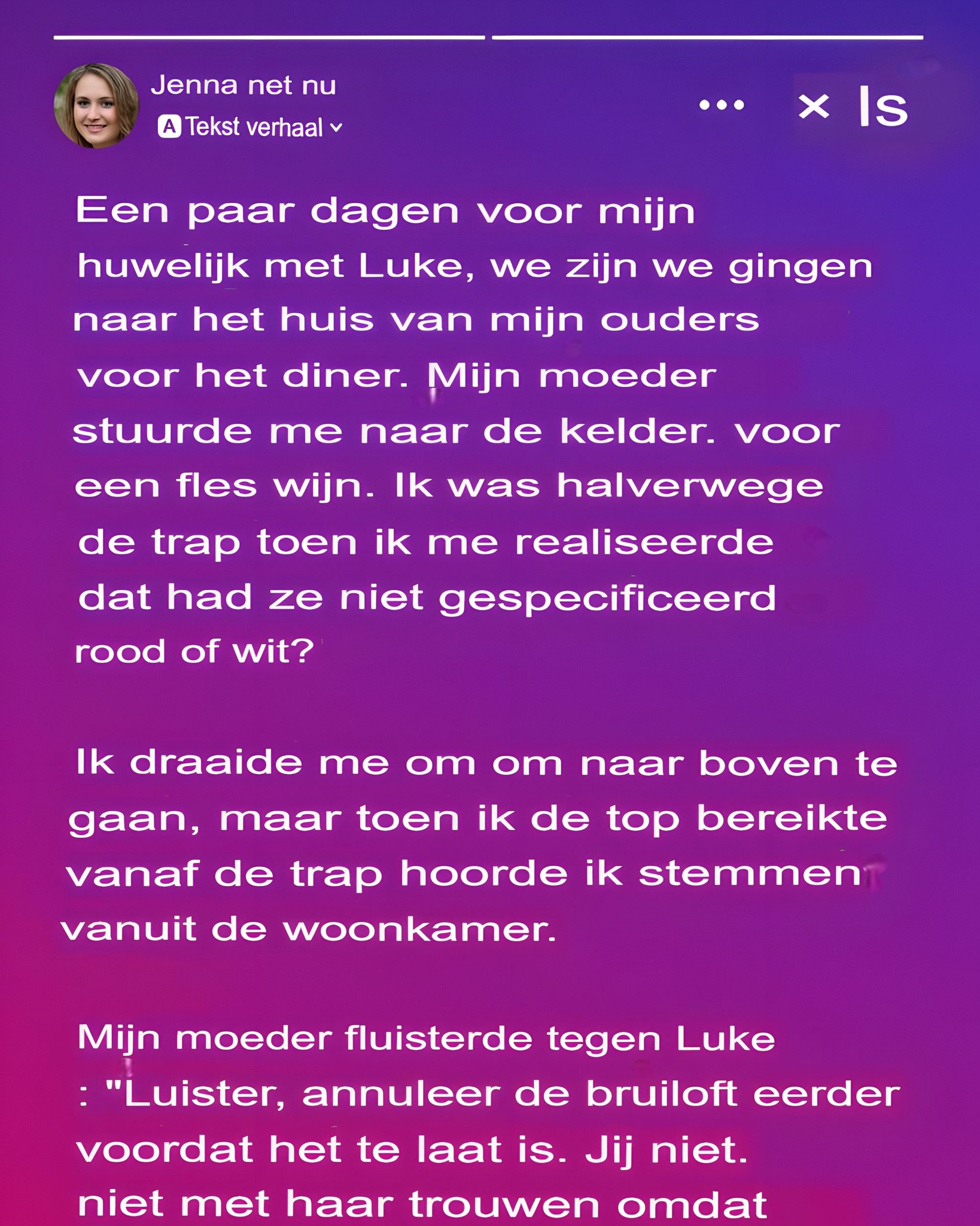 Een paar dagen voor mijn bruiloft ging ik een fles wijn uit de kelder halen. Maar op de trap hoorde ik mijn moeder tegen mijn verloofde fluisteren: « Je moet niet met haar trouwen. » Ik stond verstijfd op de onderste trede en luisterde naar mijn moeder die een geheim onthulde dat ik jarenlang had verborgen.