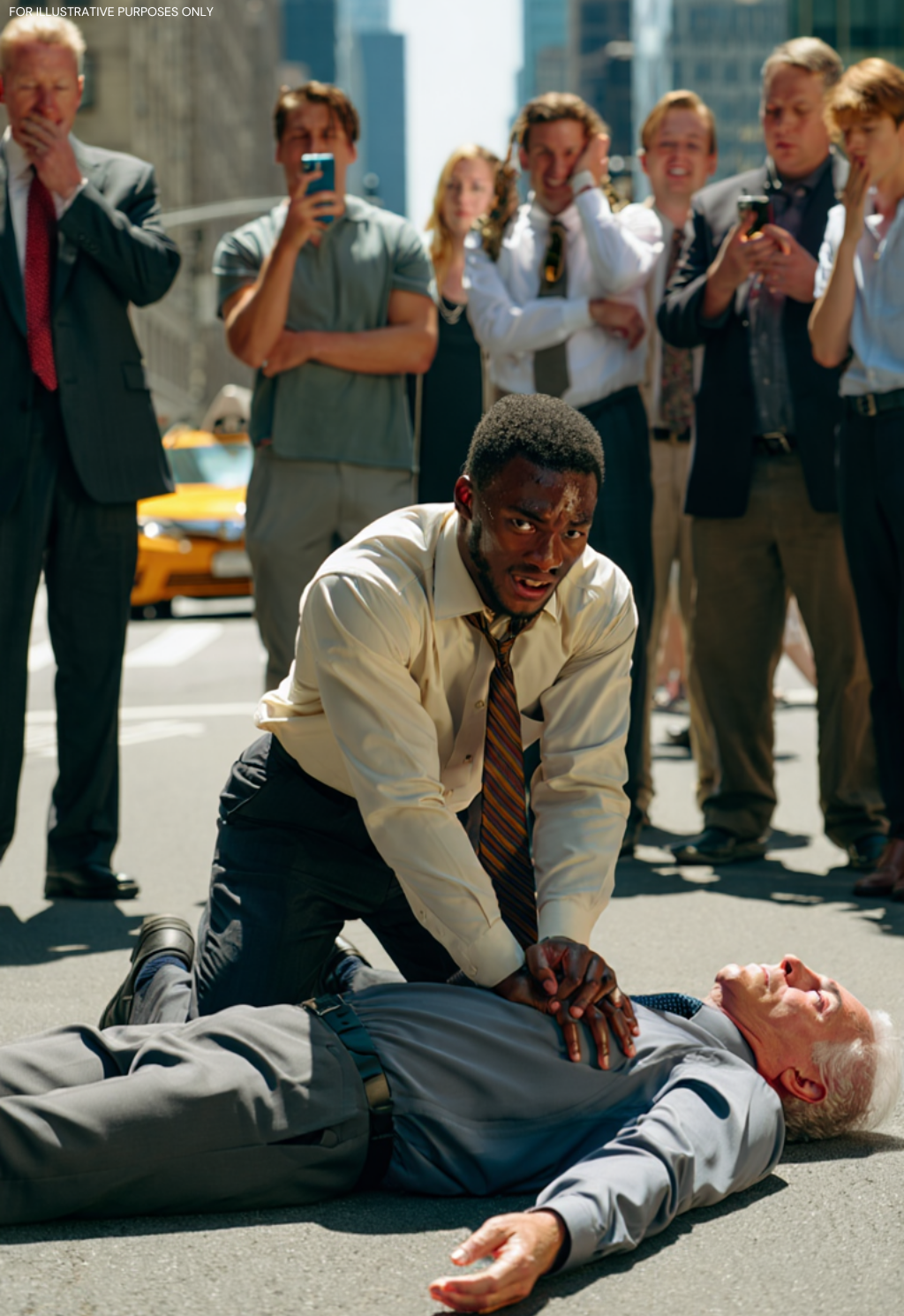 Darius rende naar de gevallen vreemdeling toe. Hij knielde naast hem neer en sprak snel. « Meneer, kunt u me horen? » De lippen van de man waren bleek. Geen antwoord. Darius herinnerde zich de reanimatietraining die hij ooit had gevolgd tijdens een vrijwilligerscursus. Zijn handen trilden toen hij begon met hartmassage, ritmisch drukkend op de borst van de man terwijl hij om hulp riep.
