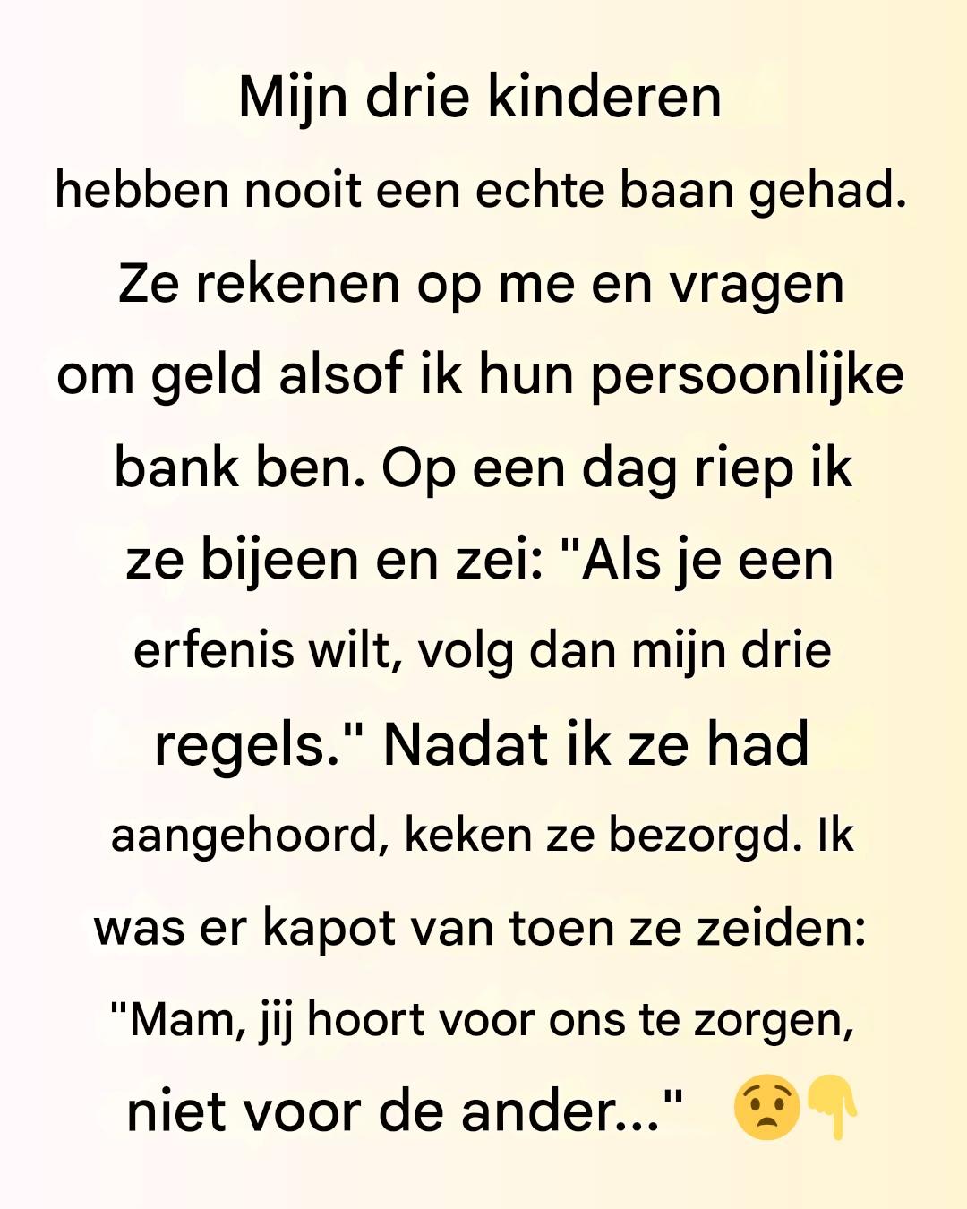 Een moeder vertelde haar drie volwassen kinderen dat ze haar erfenis alleen zouden krijgen als ze zich aan drie basisregels hielden. In plaats van in te grijpen, lachten ze haar uit. Nu vraagt ​​ze zich af of het afschaffen van hun rechten haar egoïstisch maakt of dat het haar eindelijk bevrijdt.