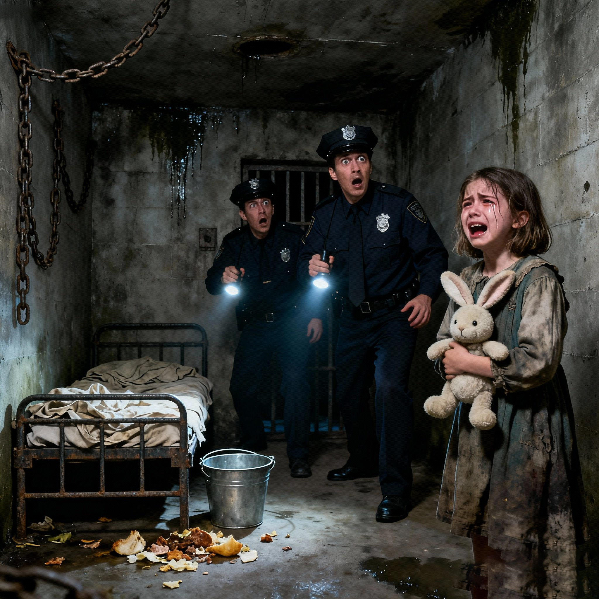 Toen ze werd ondervraagd, fluisterde Emily: « Ze laten me hier elke nacht slapen. Ze zeggen dat ik stout ben. Ik krijg alleen eten als ik mijn klusjes afmaak. Soms vergeten ze het. »