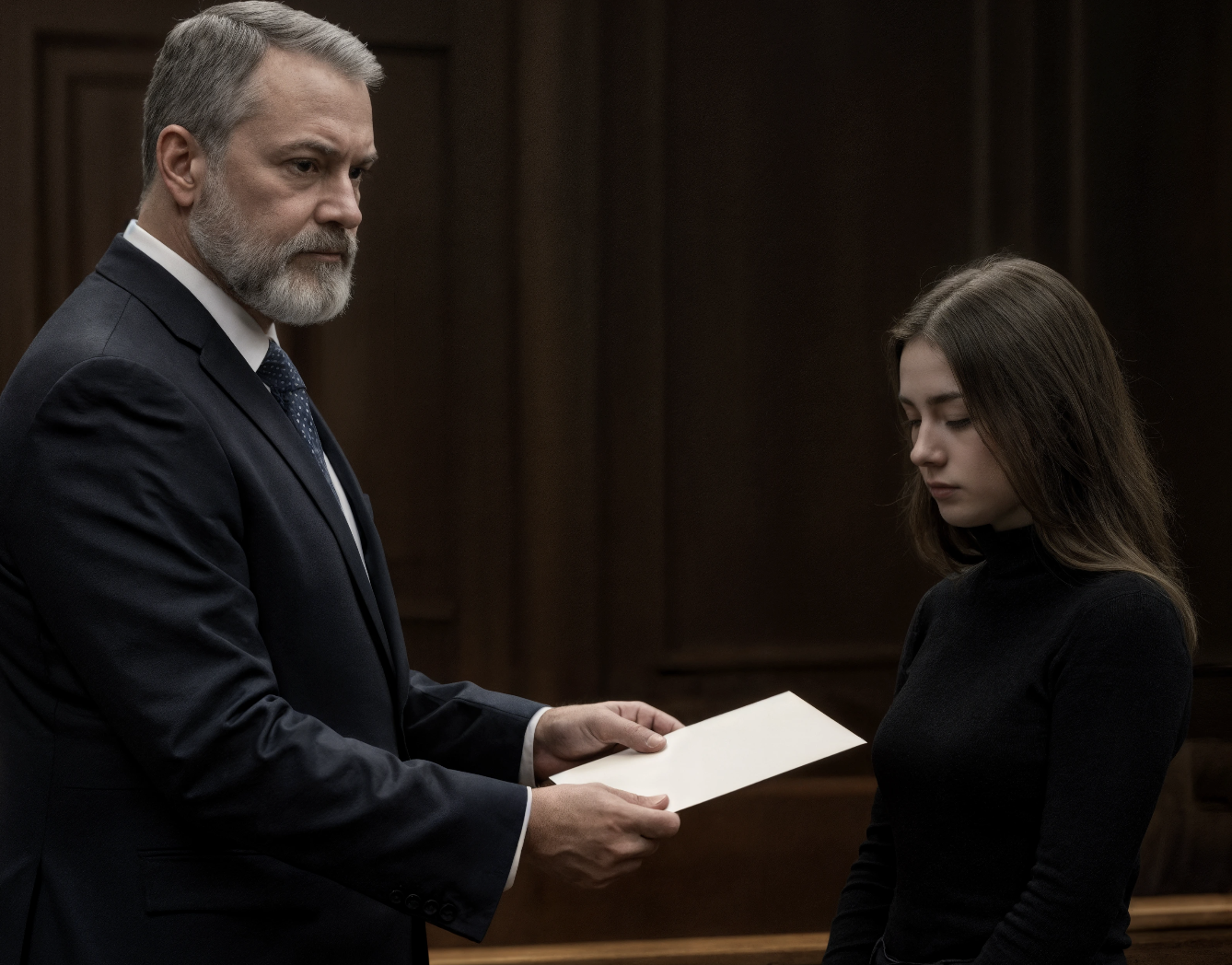 « Hij is van je vader, » zei hij zachtjes, terwijl hij me een zorgvuldig gesloten envelop overhandigde.