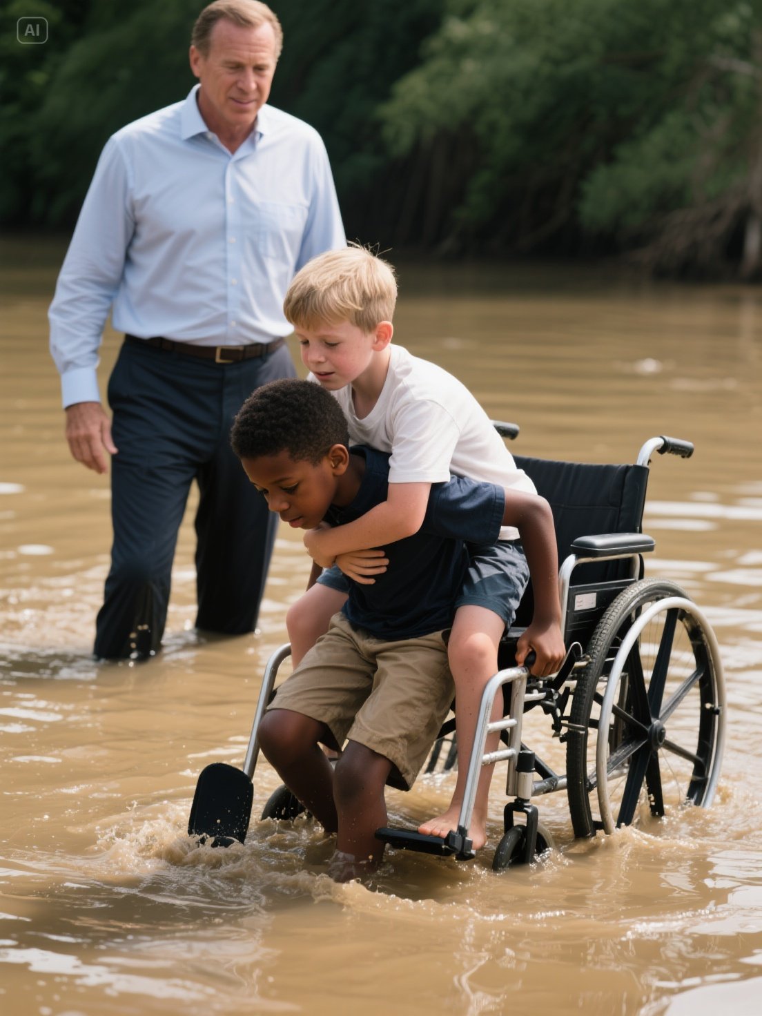 Te midden van dit alles stond een kleine rolstoel, half weggezakt in de modder. Binnenin vocht de tienjarige Eli Whitaker tegen zijn tranen. De banden trilden op de koude metalen wielen en slipten herhaaldelijk. Zijn benen – verlamd sinds zijn geboorte – bungelden slap en angst trok aan zijn borst als een levend wezen.