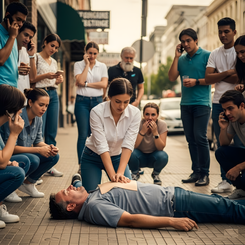 Eerst dacht ze dat het een klein ongeluk was — misschien was er iemand gestruikeld. Maar toen zag ze hem: een man van in de vijftig stortte in op de stoep, zijn gezicht bleek, zijn borst onbeweeglijk. Mensen stonden in de buurt, bevroren, telefoons in hun handen, om hulp roepen maar niets doen.