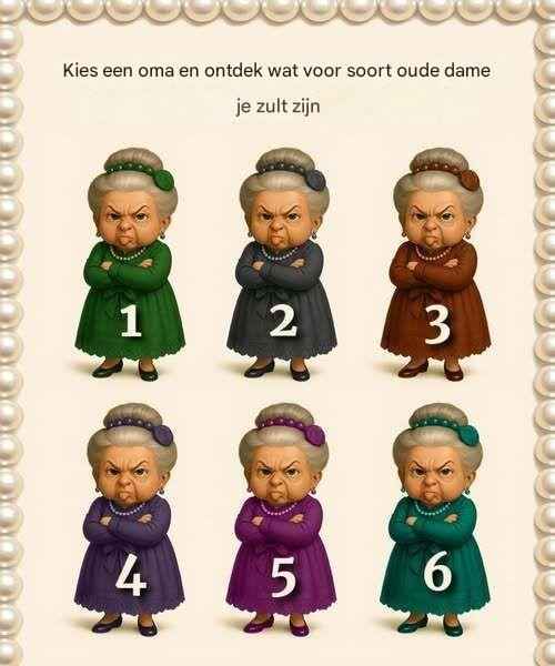 Stel je zes oma’s voor, elk met hun eigen persoonlijkheid: de warme bakker, de stijlvolle koningin, de vrije geest, de zachtaardige genezer, en meer. Wie past bij jou? Vertrouw op je eerste gevoel. Je keuze zal onthullen wat voor soort oudere vrouw je zult zijn – en misschien zelfs welke erfenis je achterlaat.