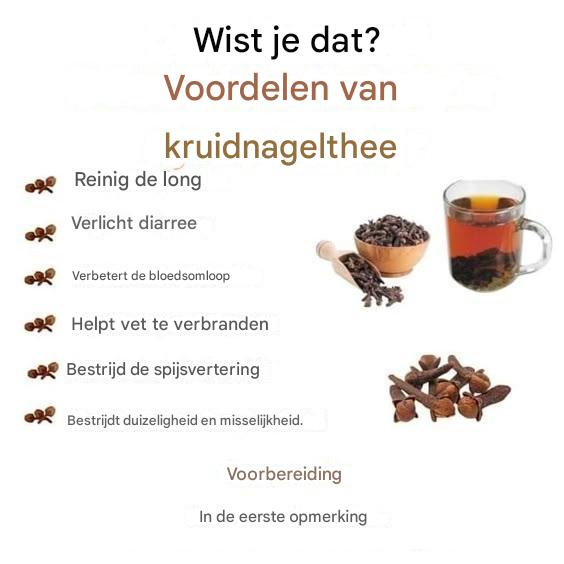 Kruidnagel is een zeer gewaardeerde specerij, niet alleen vanwege het intense aroma en de smaak, maar ook vanwege de krachtige geneeskrachtige eigenschappen. In combinatie met water vormt het een natuurlijke drank met talrijke gezondheidsvoordelen. Deze eenvoudige en goedkope infusie is een uitstekende manier om te profiteren van de actieve bestanddelen in kruidnagel, met name eugenol, dat antibacteriële, pijnstillende, ontstekingsremmende en spijsverteringsbevorderende eigenschappen heeft.