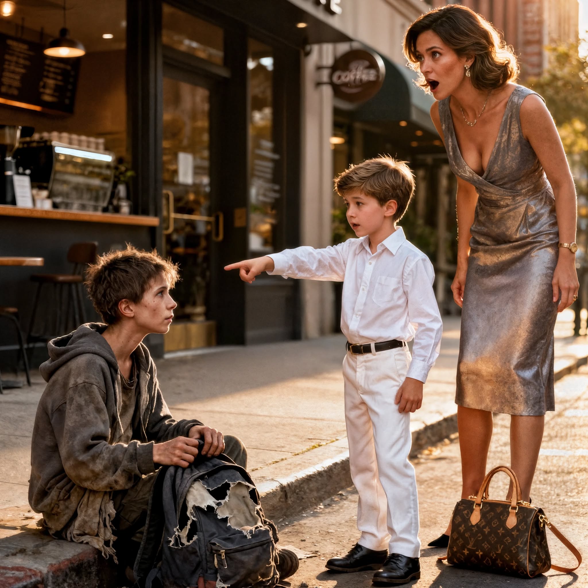 Aan de overkant van de straat, vlakbij de hoek van een bakkerij, zat een jongetje ineengedoken onder een kapotte paraplu. Zijn kleren waren doorweekt, zijn haar was klittend en klittig. Hij at wat er over was van een weggegooid broodpapiertje. Ondanks de viezigheid was er iets aan hem dat vreemd vertrouwd was: dezelfde diepbruine ogen, dezelfde kuiltjes in zijn kin, dezelfde zachte welving van zijn mond.