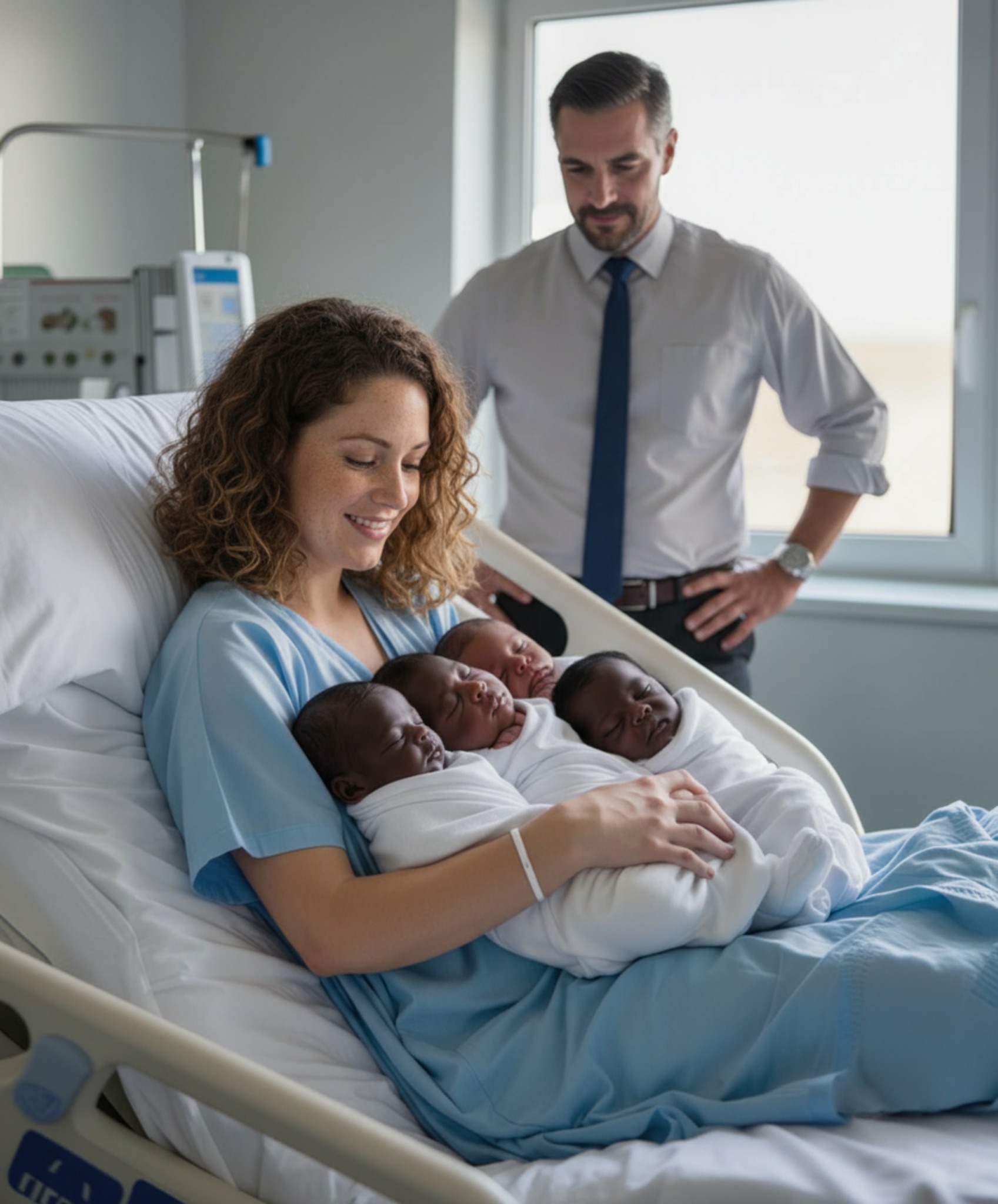 Młoda matka, wyczerpana, ale promieniejąca, uśmiech się przez łzy, ukryte na twoich czworaczkach. Malutkie, kruche i idealne.