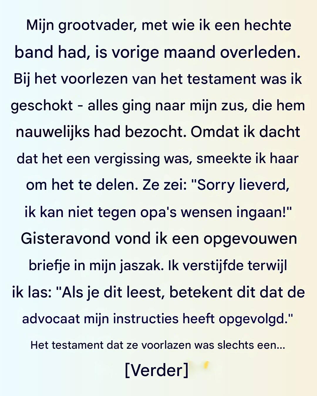 Een paar maanden later trok ik mijn oude jas aan en voelde iets in de zak. Het was een opgevouwen briefje. Mijn hart stond stil toen ik opa’s handschrift zag. Hij moet het er tijdens zijn laatste dagen in hebben gestopt, toen ik hem elke dag bezocht.