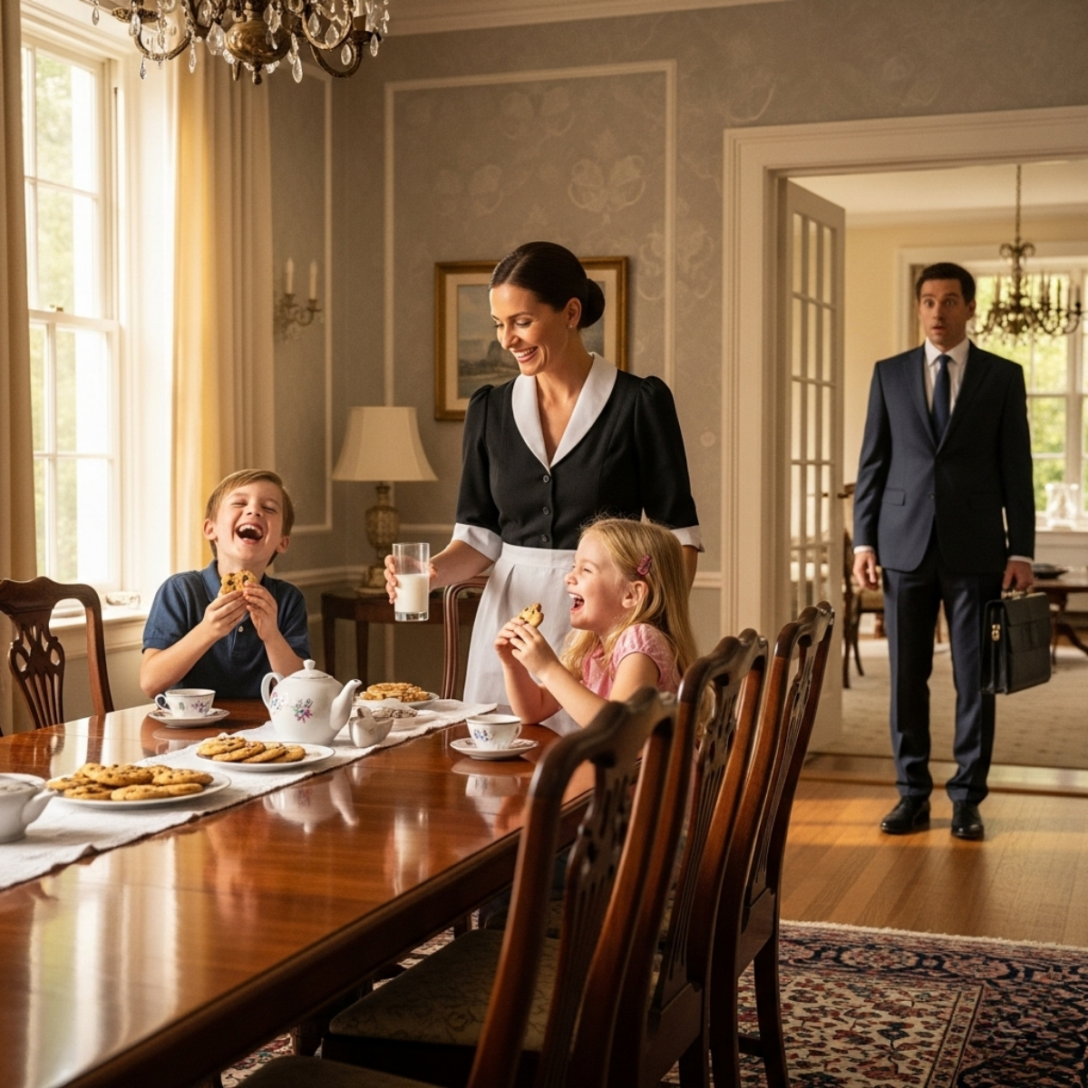 Zijn voetstappen vertraagden terwijl hij het geluid volgde, en toen hij de deuropening bereikte, bracht het tafereel hem bijna op zijn knieën. Daar stond Rosa, in haar smaragdgroene uniform, haar haar netjes naar achteren gebonden onder haar dienstmeisjesmuts. Voor haar zaten Ethan en Lily, hun gezichten stralend van geluk.