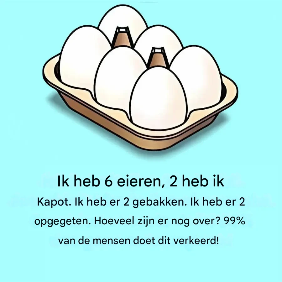 Stel je voor dat je voor 6 eieren staat. Hoeveel zijn er eigenlijk nog over na het gebruiken van 2? Een simpel raadsel met een verrassend antwoord…