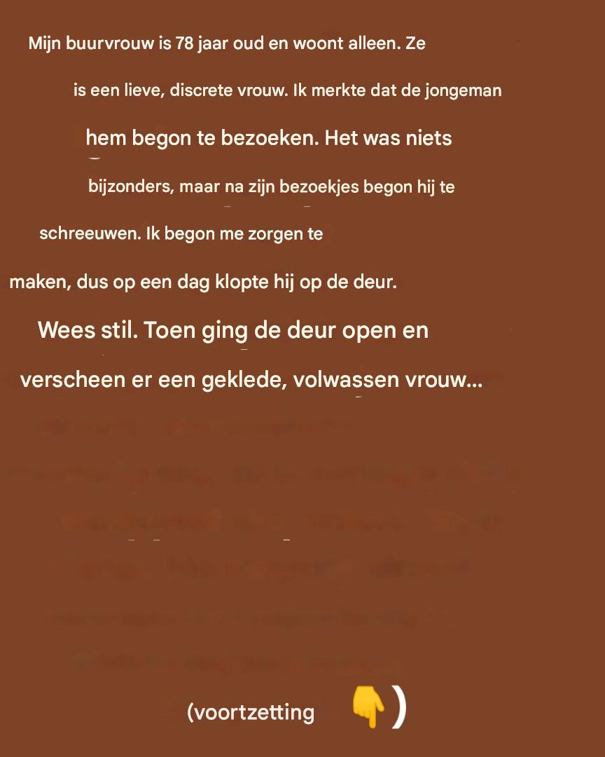 Jarenlang had Madame Dupont – 78, weduwe, zonder kinderen in de buurt – alleen in haar appartement gewoond. Altijd beleefd, enigszins gereserveerd, belichaamde ze voor Thierry het beeld van een stille pensionaris. Tot die ochtend. Terwijl hij de planten op het balkon water gaf, verstijfde een onverwacht geluid hem: gedempt maar zeer reëel geschreeuw klonk vanuit het appartement ernaast. Twijfel, bezorgdheid… Was ze in gevaar? Zonder aarzelen rende hij naar haar deur.