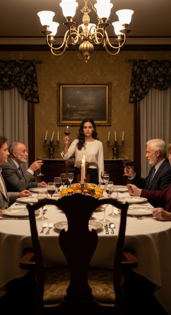 De kamer werd stil. De zelfvoldane glimlach van mijn stiefbroer Declan verdween. Viviens champagneglas trilde. Mijn vader, Sterling, bleef ijzig staren. Ik stond op en hief mijn glas. « Een toost, » kondigde ik aan met een heldere en zelfverzekerde stem, « op de laatste keer dat je me zult zien. » En ik meende het, met heel mijn hart.