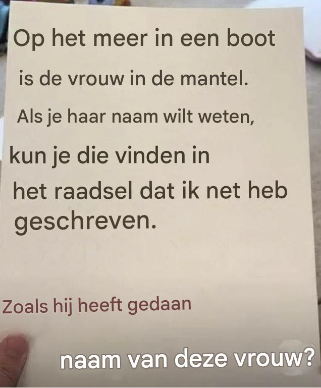 Een vrouw zit in een boot. Ze kijkt naar beneden en pakt een papiertje. Er staat een naam op. Ze glimlacht, want dat was het antwoord waar ze naar zocht. Wat is die naam?