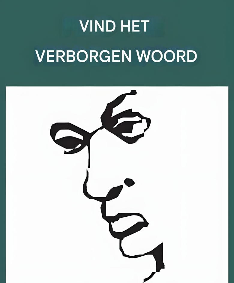 De afbeelding van kunstenaar Paul Agule verspreidde zich voor het eerst massaal op sociale media. Op het eerste gezicht ziet het er gewoon uit, maar het verbergt een woord in de gelaatstrekken. Bestudeer de neus, ogen, lippen en kin. Let op hoe de lijnen en contouren samenkomen. Een ander gezichtspunt kan helpen. Kantel je hoofd naar rechts of draai de afbeelding iets om het ontwerp duidelijker te maken.