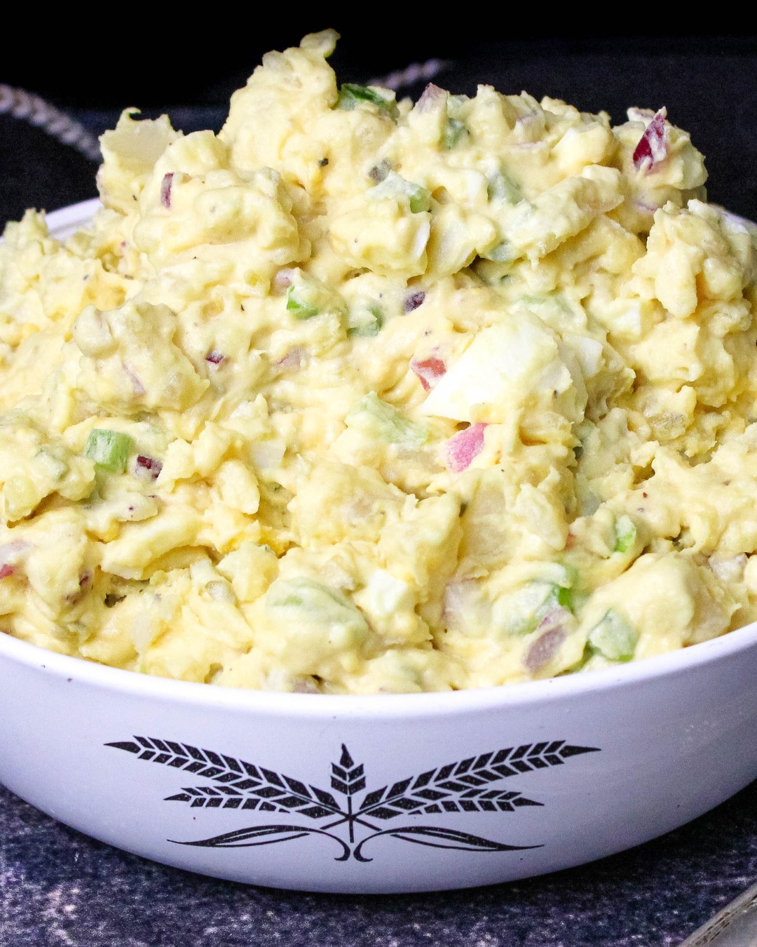 Net als gebakken kip zijn er waarschijnlijk net zoveel recepten voor aardappelsalade als er picknicks of feestjes zijn in het Zuiden. Elk recept bevat iets meer van het ene ingrediënt en iets minder van het andere. Maar dit traditionele recept, met zijn klassieke romige textuur, is het beste en de favoriet van mijn familie!