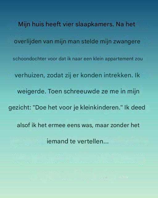 Haar woorden raakten me dieper dan ik had verwacht. Dit huis was het leven dat mijn man en ik in 41 jaar hadden opgebouwd – elke hoek had een verhaal, elke muur fluisterde zijn naam. Ik was er niet klaar voor om het op te geven – noch door verdriet, noch door manipulatie.